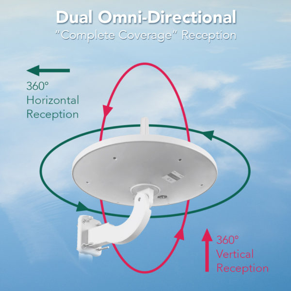 The Dual Omni UFO provides a reception pattern of 360° both horizontally and vertically, with a reach of up to 65 miles in diameter. No rotating needed.