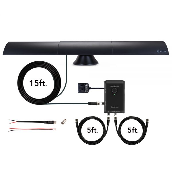 The ANTOP AT-500SBS Black HD SMART BAR Amplified HDTV&FM Antenna puts free over-the-air HDTV viewing within your reach. Receive popular channels like ABC, CBS, NBC, PBS, Fox, Univision and others from up to 80 miles away. Its Smart Boost System delivers the correct balance between short-, mid- and long-range signals to give you plenty of viewing options.