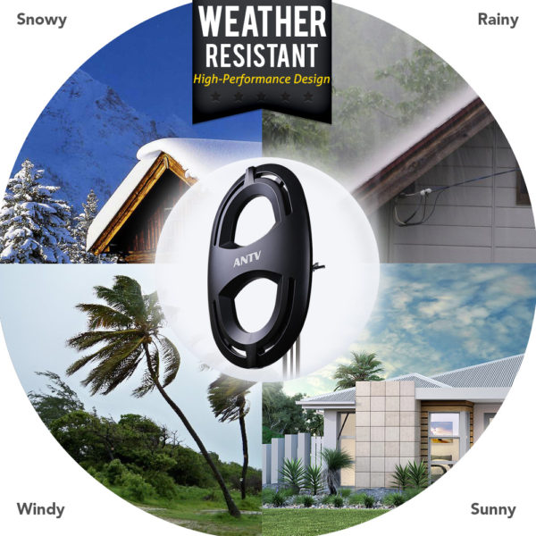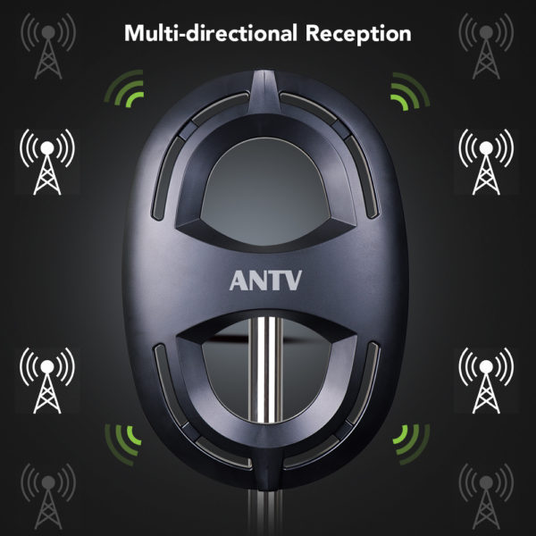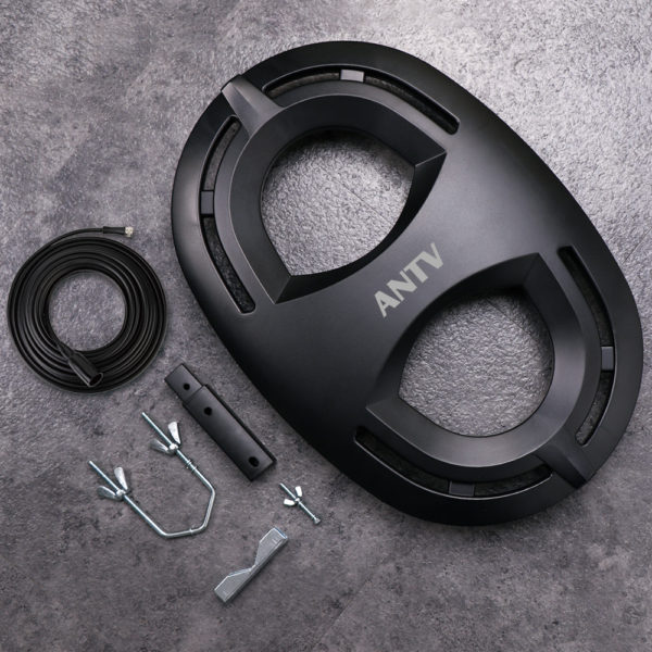 ANTV Digital Outdoor/Attic HDTV Antenna with enhanced VHF reception, model No. ANTV2003. Compact size with a matte black finish is suitable to match a wide range of home décor styles.
