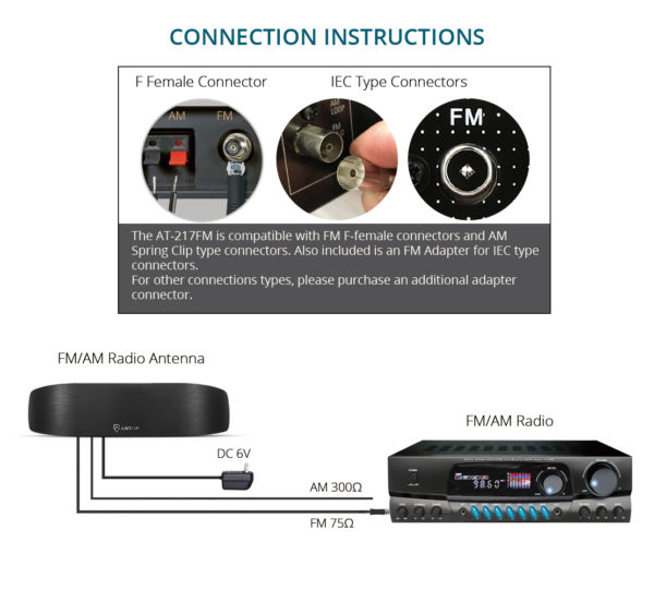 Prior to purchasing this antenna, check the connector types of your AM/FM radio. This antenna is equipped to match FM “F” Female connectors and AM Spring Clip connectors. Also includes an IEC male to F female coaxial adapter connector.