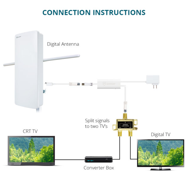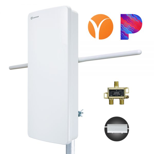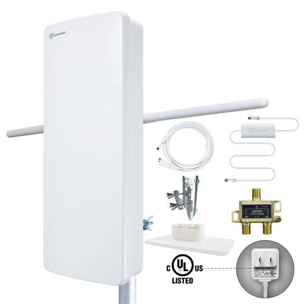 ANTOP Premium Pack AT-400BVC5 comes including a flat-panel “Big Boy” AT-400BV Smartpass Amplified Outdoor/Indoor HDTV Antenna and a 2-Way splitter AT-705 for feeding 2 TV’s.