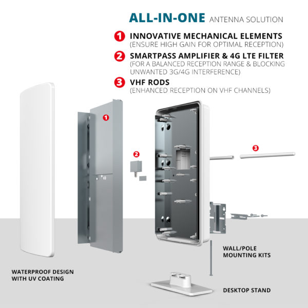 1) Smartpass Amplifier, exclusive ANTOP technology, uses an all-in-one design allowing easier connection while delivering the correct balance between short and long range reception.