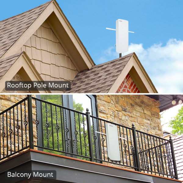 The flat-panel “Big Boy” antenna in the pack is sleek, compact, lightweight, aesthetically pleasing and suitable to match a wide range of home exterior styles. The simple set-up design enables you to quickly install in various locations around the exterior of your home: roof, balcony. It is also suitable for indoor use in an attic or placed on a table top by using the stand.