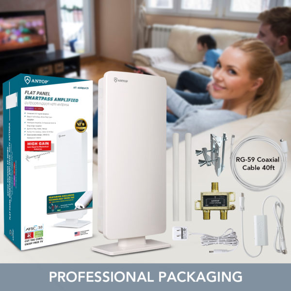 • FREE TV FOR LIFE! No monthly bill for watching TV! ANTOP Premium Pack AT-400BVC5 provides HDTV Antenna with MULTI-DIRECTIONAL technological characteristics receives free broadcast High Definition Over-the-Air TV signals, such as ABC, CBS, NBC, PBS, Fox, Univision and others. Compatible with TV converter boxes and digital televisions/4K Ultra High Definition (4K UHD) TVs.