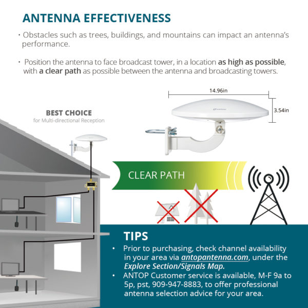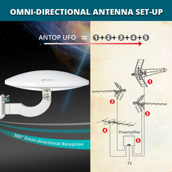 - Engineered and designed in USA by ANTOP, the antenna specialists, the AT-414BC5 UFO OTA digital TV antenna features 55 to 65-MILE reception long range from point of signal origination with 360 DEGREE Omni-directional technological characteristics providing excellent non-adjustment reception from various signal origination locations. A built-in 4G FILTER blocks 3G and 4G wireless signals to ensure noise-free digital TV reception.
