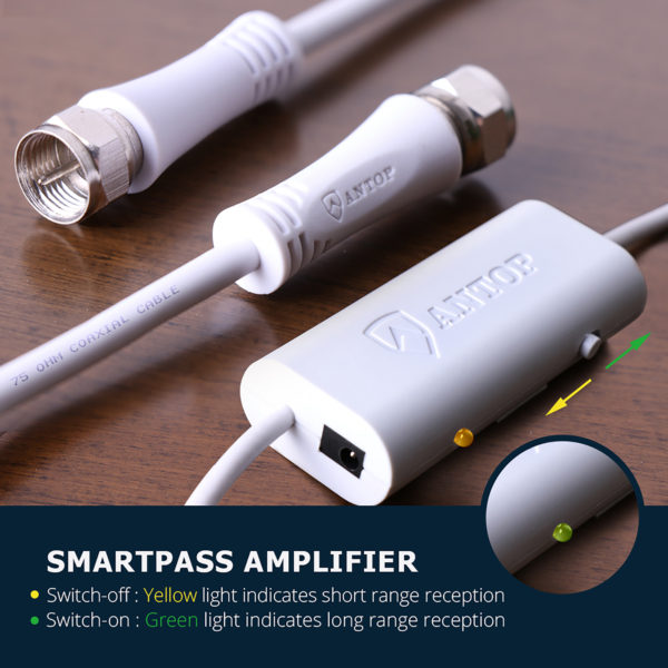 - Smartpass Amplifier, exclusive ANTOP technology, uses an all-in-one design allowing easier connection while delivering the correct balance between short and long range reception.