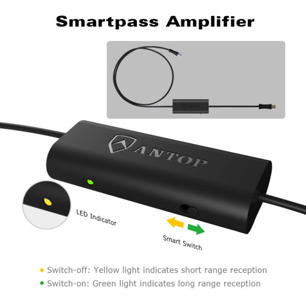 - Engineered and designed in the USA by ANTOP, the antenna specialists, the ANTOP SMARTPASS AMPLIFIER features a SMART SWITCH to balance the amplification between short and long range signals received by the antenna. The Smart Switch is recommended to be switched ON to boost weaker signal level reception, and switched OFF to avoid amplification overload for stronger signal reception. The SMARTPASS AMPLIFIER is not recommended for use with an amplified antenna.