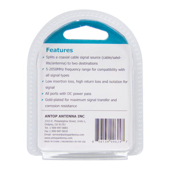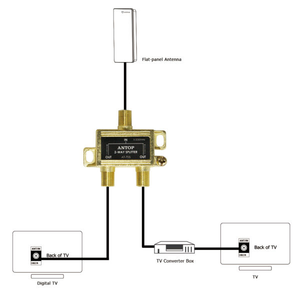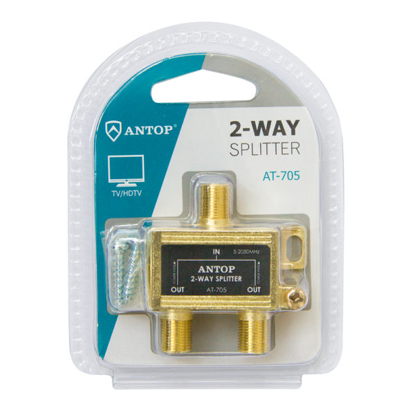 The ANTOP 2-way splitter AT-705 splits a single incoming coaxial signal, such as satellite signal, over-the-air HD (digital TV) antenna signal, into two outgoing signals.