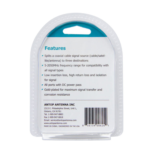 The ANTOP 4-ways Splitter AT-707 splits a single incoming coaxial signal, such as satellite signal, over-the-air HD (digital TV) antenna signal, into four outgoing signals.