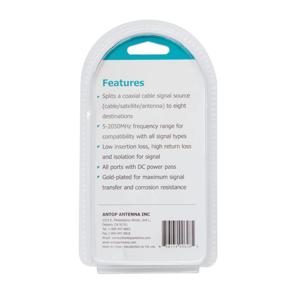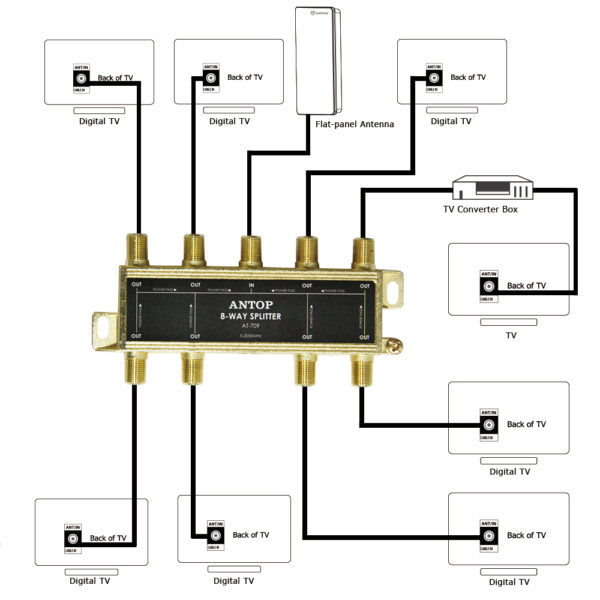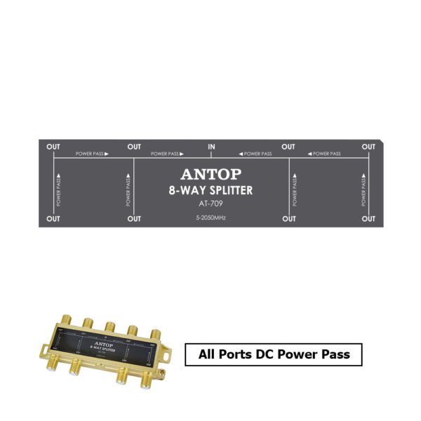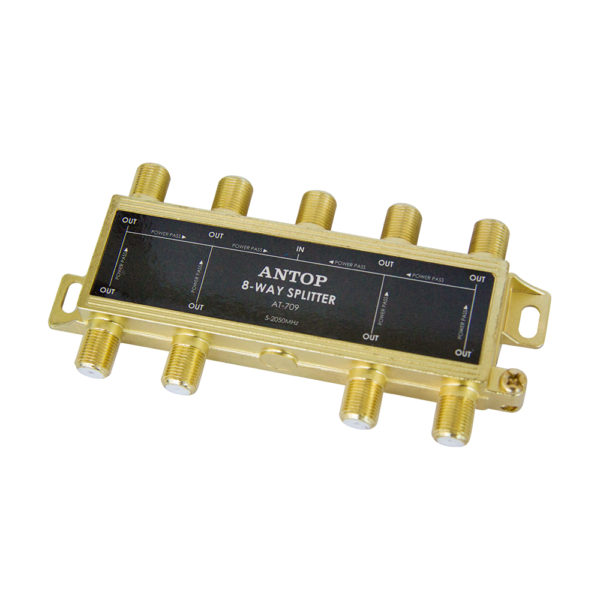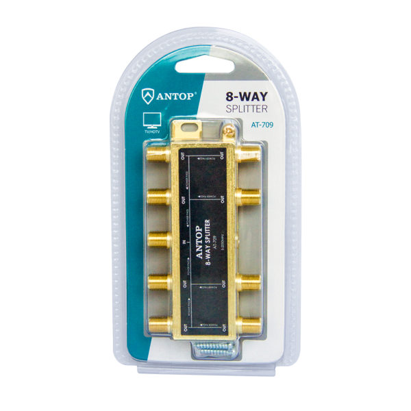 The ANTOP 8-ways Splitter AT-709 splits a single incoming coaxial signal, such as satellite signal, over-the-air HD (digital TV) antenna signal, into eight outgoing signals.