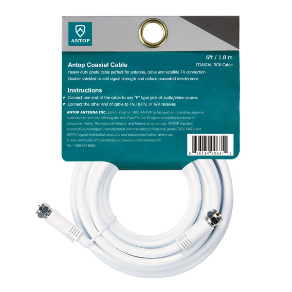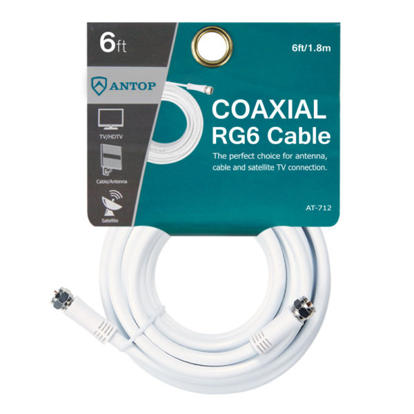 The ANTOP AT-712 6ft/1.8m Coaxial RG6 Cable can be used for Over the Air antennas, cable modems, satellite TV receivers and other coaxial F-male enabled devices connection, delivering clear picture and sound without electromagnetic & radio frequency interference. Featuring Zinc Alloy F-type connectors, this 75 OHM RG6 cable houses a copper clad center conductor, dielectric insulation and braided aluminum magnesium alloy shielding. This cable is suitable for both indoor & outdoor use.